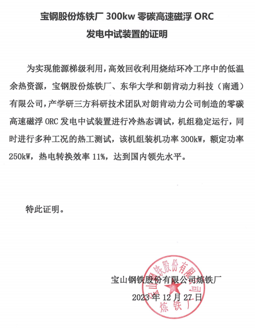 宝钢股份烧结300kW零碳高速磁浮ORC发电项目